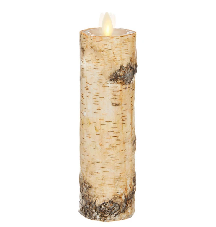 Inspired by the growing trend of natural decor this smaller diameter flameless, 2 x 8 inch pillar candle from RAZ boasts a birch embedded exterior that’s full of texture.