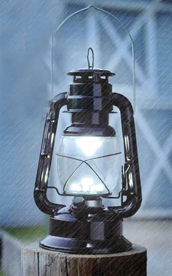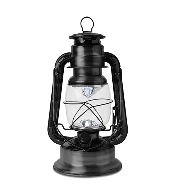 Battery operated 9.5 inch vintage style LED lantern runs on 2 D batteries. Authentic vintage styling with black finish has 15 powerful LED lights with dimmer control switch. You can hang this lantern from a swing arm handle or a hanging ring.