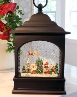 11 Inch Decorative Bronze Water Lantern With Snow Family Sledding In Swirling Glitter