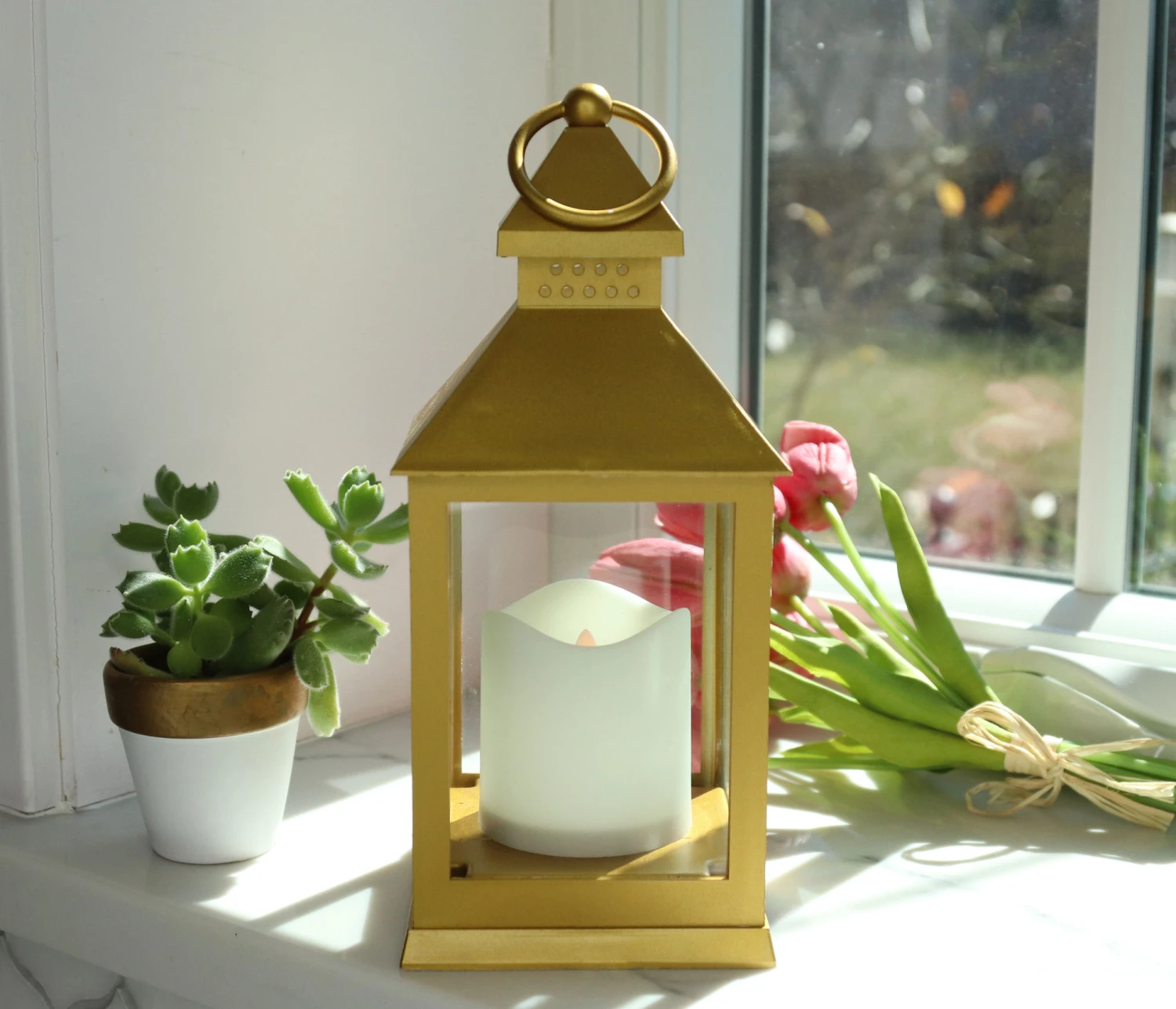 Can you believe this flameless Harvest Gold finish candle lantern is made from plastic. Great in all elements. Including a resin LED flickering pillar. Using the lantern in the timer mode will turn the candle on at the same time every day and will automatically shut it off 8 hours later.