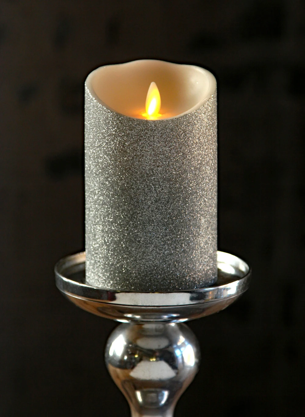 Silver Glitter Moving Flame Wax Candles are like no other battery operated candle. An internal LED source shines through a prism and up to the flame tip. The flame moves creating dance like motion that is stunning and so realistic.Add to your Holiday decor, anniversary party or next event.