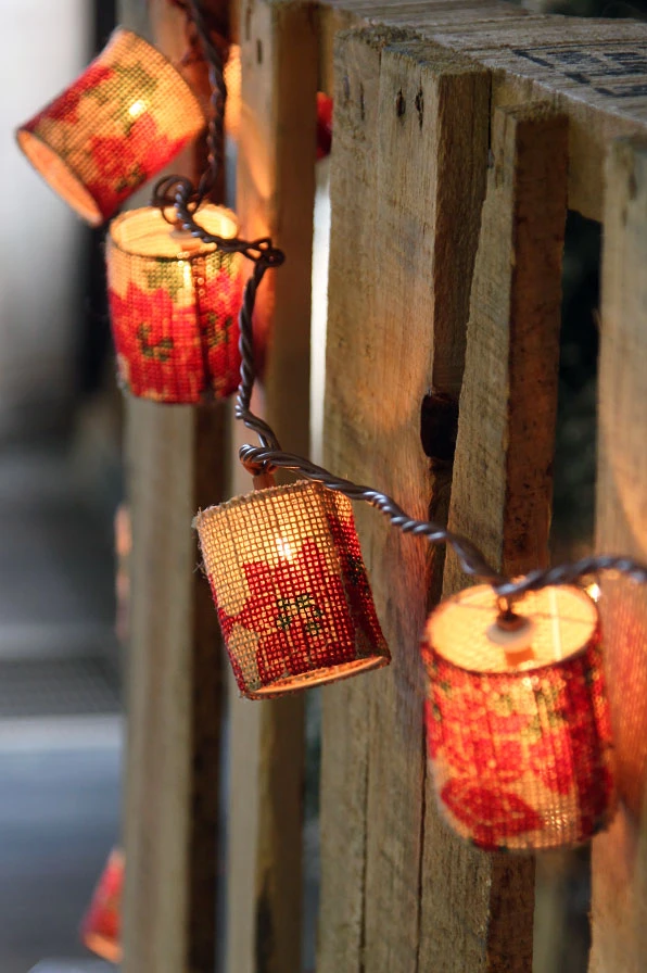 Add a warm and inviting glow with our new poinsettia design burlap patio string light count of 10. A traditional way to decorate for the Christmas and Holiday Season.