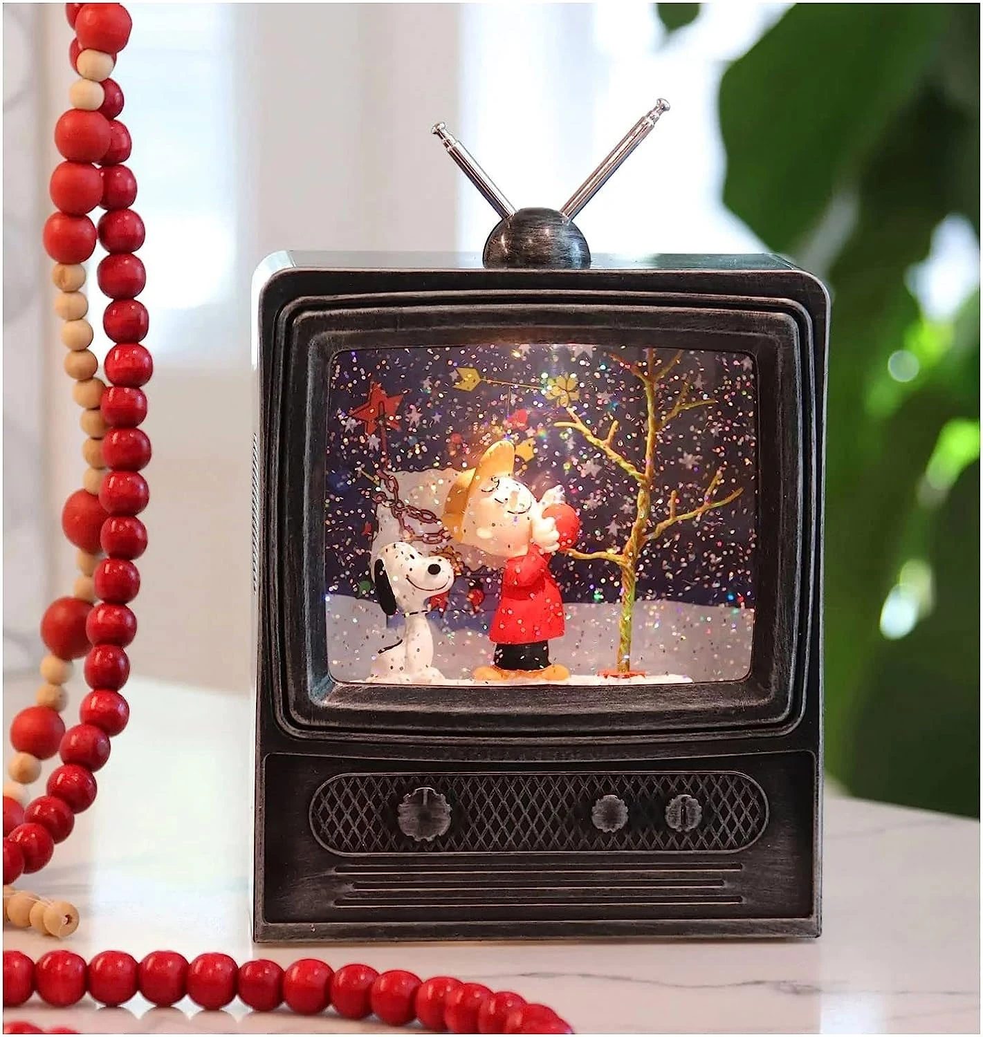 Peanuts Snoopy with Charlie Brown’s Christmas Tree scene inside of a TV water lantern with antennas and optional music Setting.